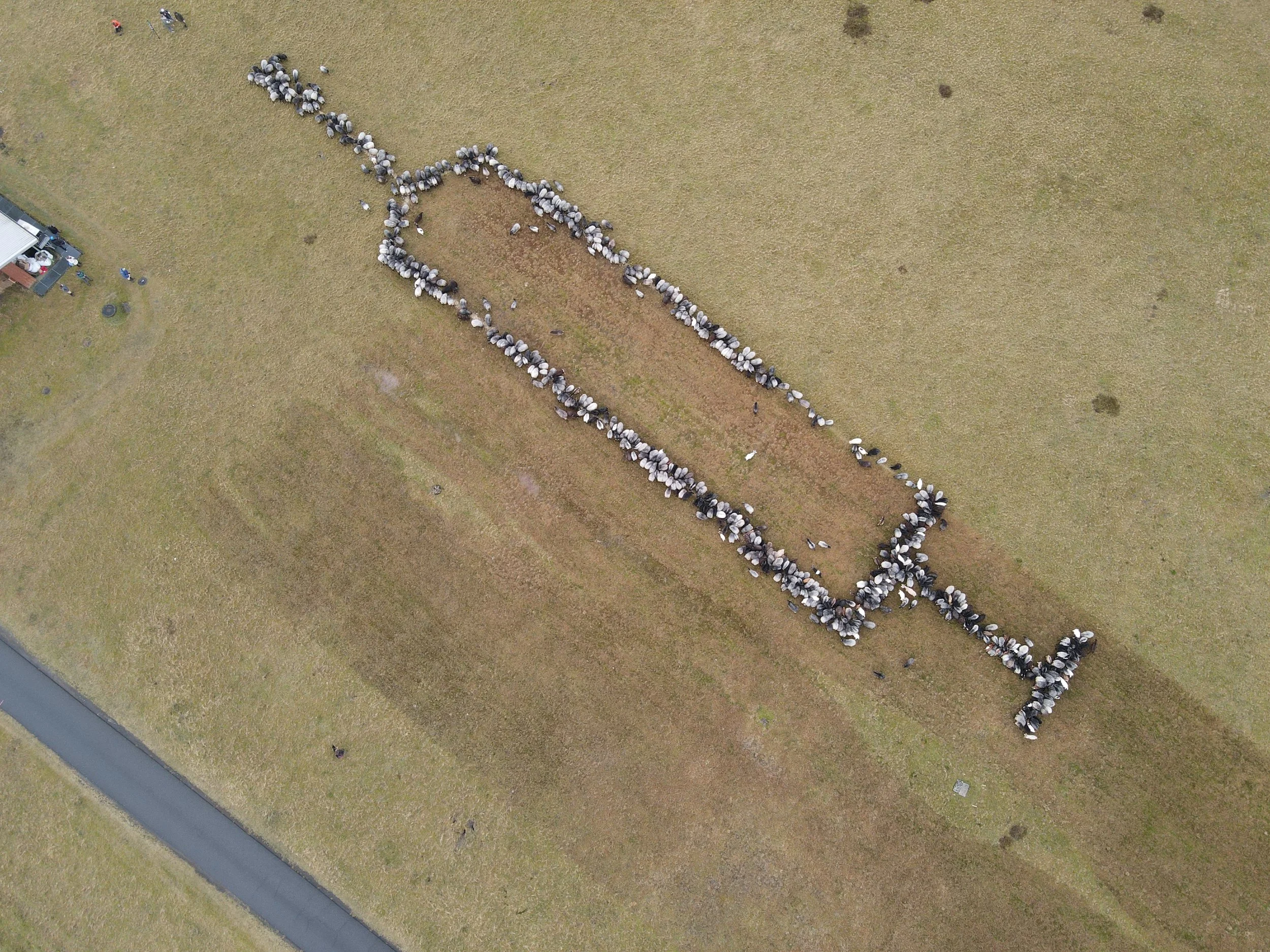 Bei Hamburg - jüngere und ältere Männer und Frauen haben eine Herde von mehreren hundert Schafen u-förmig eingeschlossen. Nach vorne zwischen den beiden Schenkeln des U hindurch sollen sich die Schafe auf einem Weg langsam zur nächsten grünen Weide vorwärts bewegen. Jemand ganz hinten klatscht in die Hände, um die Herde anzutreiben. Die setzt sich von hinten in Bewegung, doch vorne staut es sich. Die menschliche Führungsspitze verharrt auf der Position und blockiert die Vorwärtsbewegung. Von hinten rücken die Schafe vor, doch vorne staut es sich. Es kommt wie es kommen muss. Die Schafe brechen an der schwächsten Stelle des U-förmigen Teams aus und suchen sich ihren eigenen Weg - durch einen Wassergraben auf eine Kuhweide. Jetzt heißt es um die flüchtende Herde herum, sie stellen und wieder auf den vorgesehenen Weg bringen.